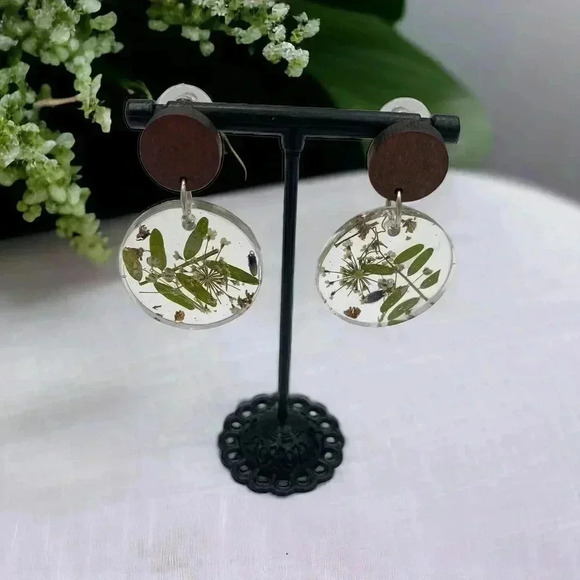 Floral Preservation Art to Wear Statement Dangle Resin Earrings Walnut Studs