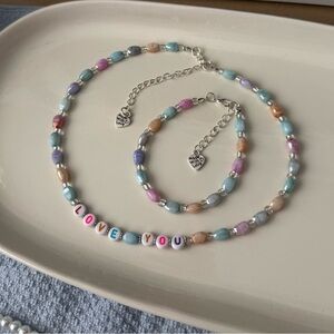 This delicate necklace features a playful arrangement of small, round beads in pastel pink and blue hues. The evenly spaced beads create a harmonious pattern, making it a charming accessory for any occasion.
