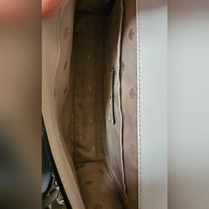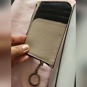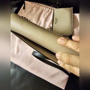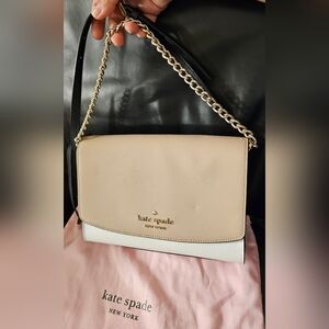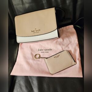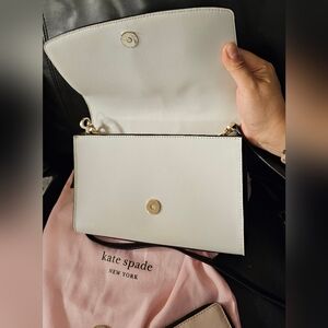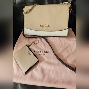 Three piece set: Excellent used condition Kate Spade Madison Colorblock Convertible wear as a Crossbody or Clutch style WKR00102, two straps included. Cream, white and black Colorblock trio geniune Saffiano Leather. Flap snap closure, with Metal pinmount logo in goldtone. Iconic KS spade jacquard lining, inside slip pocket. Adjustable removable shoulder strap 22" drop and chain strap with 6.5” drop, pink Kate Spade dust bag included, purse measures 9 inches by 6 inches by 2.5 inches. Comes with matching slim wallet also in excellent used condition no callouts. Wallet has attached keyring, corner zipper closure with four credit card slots and two pockets. Measures 5 inches by 3 inches. Ships from smoke-free and pet free home.