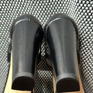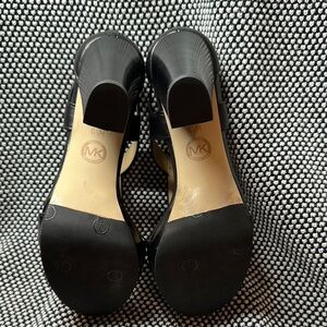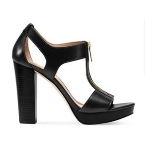 These chic black platform sandals by Michael Kors boast a bold T-strap design with a striking gold zipper. The platform high heel and smooth leather-like material offer both style and comfort, while the open toe and cutouts add a modern touch. 4 inch heel and my shoe guy added non slip pads to the bottom sole . Never worn outside.