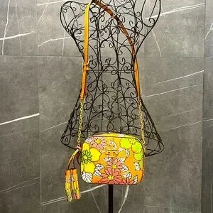 Tassel-trimmed camera bag crafted of leather with a vintage-inspired vibrant floral motif. Zip top Exterior back slip pocket Goldtone hardware One interior compartment Inside slip pocket Leather Lining. Handbags - Tory Burch Handbags