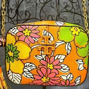 Tory Burch camera bag crafted of leather with floral motif.