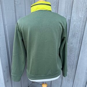 Excellent condition, like new Polo Ralph Lauren olive sweatshirt (performance fabric) with neon patch pocket and polo pony logo. Packable hood folds into collar. Size medium. Measured laying flat, armpit to armpit width are 22.5”, sleeve length is 25” and length is 26.5”.
