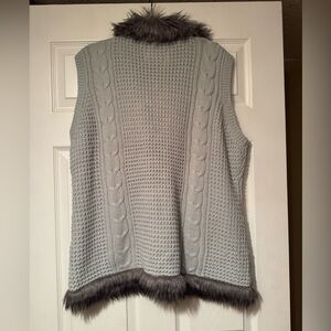 Sporto Size XL Gray Blue Cable Knit Sweater Vest with Faux Fur Trim and toggle close. Stylish gray blue cable knit vest featuring faux fur trim. Perfect for layering. Gorgeous piece in Excellent like new condition!