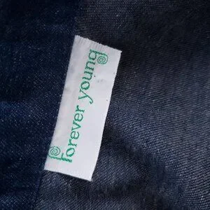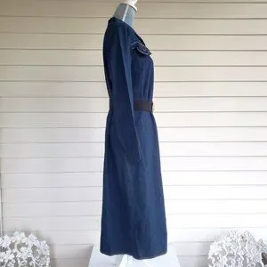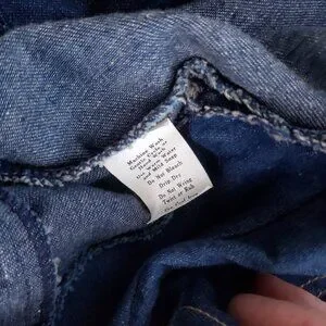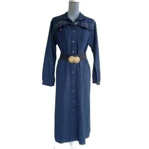 This great lightweight denim dress looks cute worn with or without a belt. (Please note that a belt is not included ). Brand is Forever Young. I am not positive of the materials but I think it is a cotton or cotton blend. There is a washing instructions tab in the shoulder seam. The Union label tag is in the seam towards bottom of dress. There are 11 metal buttons down the front. The tops of each says Kemington Express. The pockets on the front are decorative only. There is an embroidered design on the flaps.