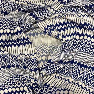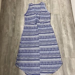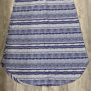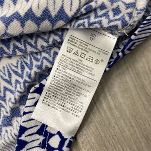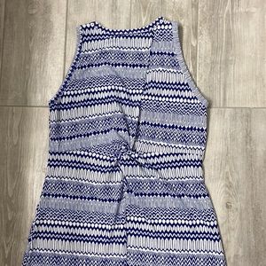 This dress is perfect for travel. It will not wrinkle and it is lightweight and complementary. It is a blend of polyester and spandex/elastane. The blue and white pattern is very pretty. It has a high neck in front and knot detail in the back for a flattering fit. The waist measures 14 inches, and from shoulder to longest part is 39 inches. Chest measures 16 inches with lots of stretch. Great dress will never wrinkle in your suitcase. Very versatile in like new condition. It kind of has a crossover open back. But does not show your back, but will be comfortable and allow you to keep cool.