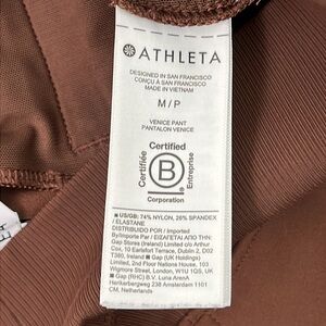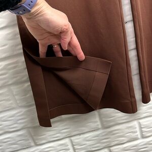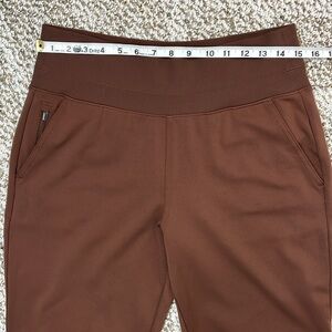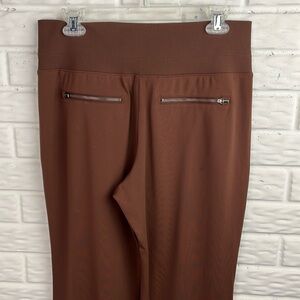 Excellent condition with no flaws like new Athleisure pants from Athleta. 5 pockets, 3 of the pockets are zippered. Flare leg style with slit at the bottom. High rise pull on. Thick quality fabric in a brown color. Size medium.