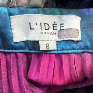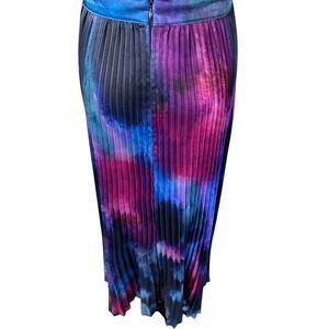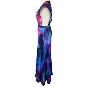 L'IDEE Gala Plisse Maxi Dress Gown in Purple Blue Multicolor Tie Dye Print. Size AU 8 = US 4. Features satin plisse fabric, deep plunging v-neck, umbrella pleat skirt, adjustable back strap, high waistline, and hidden rear zip closure. Unlined. 100% polyester. Great pre-owned condition, minor and normal signs of wear.