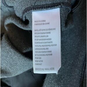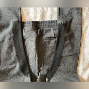 Elastic waist. False zipper in front and pocket in back. Dark charcoal color with black accent