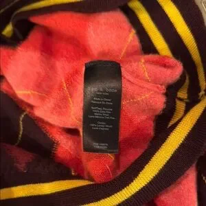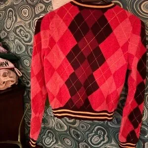 Stylish red and burgundy argyle sweater with yellow accents. Perfect for a bold look. Beyond preppy because of the bold coloring, this argyle sweater is composed of fine merino wool and has a totally interesting coloring combo of red, burgundy, and gold. Cropped length at 18” that works on most bodies, (but not if you’re tall like me at 5’11”). Chest measures 19” across, and because this is a knit, it does stretch. Would work well with high waisted jeans.