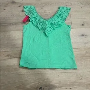 This vibrant green tank top by Lilly Pulitzer features a charming ruffled bib collar that adds a touch of elegance to its design. Crafted from a soft, lightweight fabric, it offers a relaxed fit perfect for warm weather. The solid color and stylish details make it a standout piece for casual summer outings.