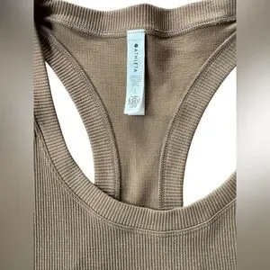 Athleta top NWT 18” PTP however seems larger due to stretch. I am a 38c and too large for me. Tan with metallic overtones. Very pretty neutral.