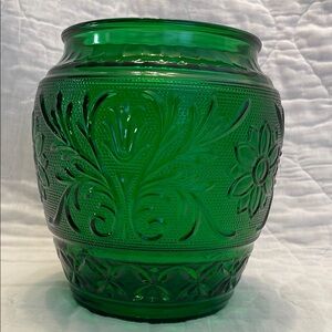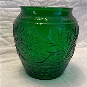 The item shown is an Anchor Hocking Sandwich Green vase, produced in the mid-20th century. Also know as a Biscuit Jar.