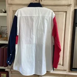 Stylish colorblock men's shirt featuring bold red, white, and blue panels. Perfect for a modern, casual look. By Orvis the shirt is 100%. It is a size medium. There are two small rust spots on the back of the shirt.