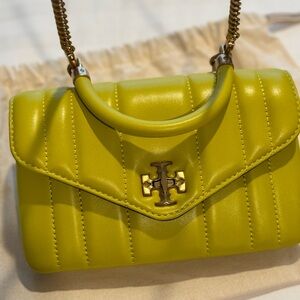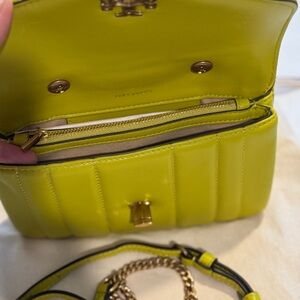 This Tory Burch crossbody bag in a green lime hue is crafted from textured leather, featuring a structured boxy shape with vertical quilting for added elegance. The bag is adorned with a gold-tone circular emblem on the flap and comes with both a top handle and an adjustable crossbody strap, making it a versatile accessory for any occasion.