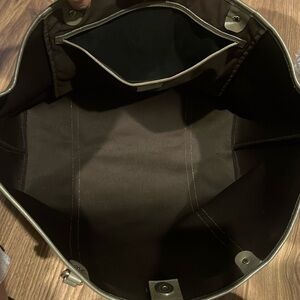 Exterior canvas has no cracks or stains. Interior has signs of used throughout/ light stains. Leather handles including trim has normal signs of used as pre-used/ light creasing/ light scratching. Corners have no holes. Please zoom in all pictures for details