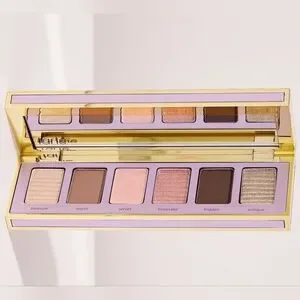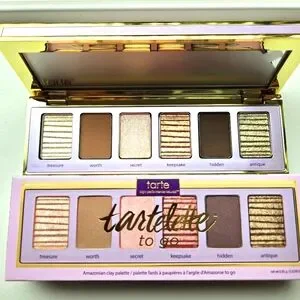 The Tarte Tartelette To Go Eyeshadow Palette, features a range of neutral shades including brown, cream, and gold tones for versatile styling. Ideal for on-the-go beauty.