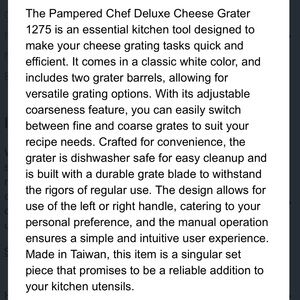 Vintage excellent pre-owned condition dishwasher safe deluxe cheese grater by PAMPERED CHEF. Fine and course stainless steel grate barrels included. Gently used.