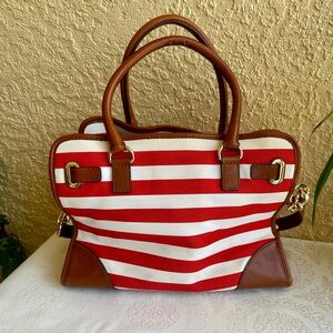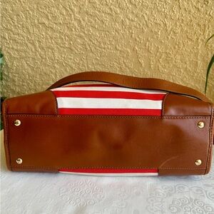 Red & white stripe with camel brown accents and gold tone embellishments.