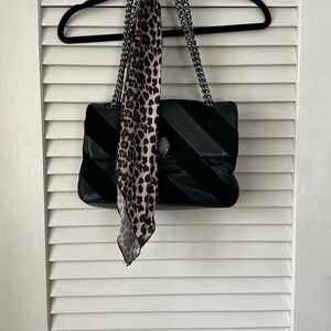 Perfect condition- no blemishes. This elegant shoulder bag by Kurt Geiger features a sleek black leather and suede design. Crystal bird head, black chain strap and leopard scarf add a fun, edgy touch.
