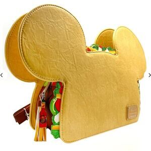 Give 'em something to taco ‘bout! The newest Loungefly x LASR Exclusive Disney Mickey Taco Convertible Mini Backpack is the hot sauce for your daily fit! This one-of-a-kind new Disney Loungefly x LA Style Rush Exclusive features a unique oversized golden taco design in the shape of Mickey’s head, complete with die-cut PU leather lettuce, tomato, and cheese! With a brown taco meat center compartment, embroidered Mickey Mouse lime squeeze back accent, fringe keychain, and metal enamel hot sauce zipper charm, this Loungefly x LASR exclusive is everything our hungry hearts and Insta feeds have been yearning for! For all our Disney-obsessed foodies, Loungefly collectors, Disney lovers, Loungefly addicts and fashion misfits this Mickey Taco bag comes both as a backpack and converts into a crossbody.