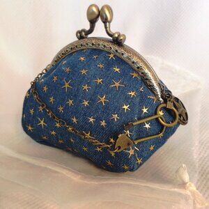 Gold Embossed Star Kiss Lock Coin Purse Key Chain Bag Charm in Blue Denim NEW