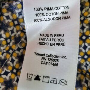 Really cool kaleidoscope print in navy blue, yellow, gray and white.