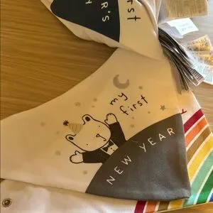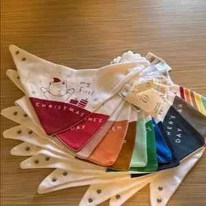 Adorable and colorful bandana bib set perfect for celebrating special occasions. Features vibrant colors like red, pink, orange, green, and blue. Soft and comfortable for your little one.