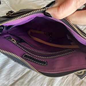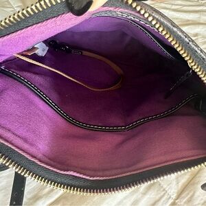 non smoking home. gently used. no obvious signs of wear. purple interior. zip front pocket. interior zip pocket, open pocket flap, two smaller open pockets (one larger, one smaller), key clasp.