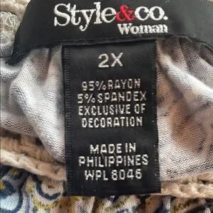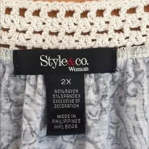 This blouse from Style & Co. showcases a striking blue and white and yellow paisley pattern, offering a relaxed and comfortable fit. The rounded neckline with a white crocheted trim adds a touch of elegance, while the long, slightly flared sleeves enhance its flowing silhouette. Perfect for both casual and work, this top is a versatile addition to any wardrobe. In gently used condition.