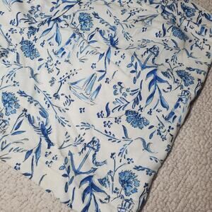 White background with blue coastal nautical print with anchors, lobster, lighthouse, seashells, flowers, etc. designs.