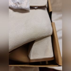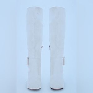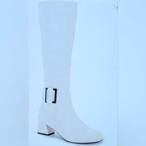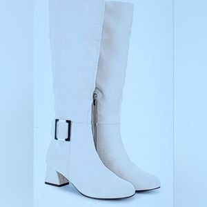 NIB FAUX SUEDE METAL BUCKLE SIDE ZIP CHUNKY HEEL KNEE HIGH BOOT BEIGE 5.5
