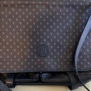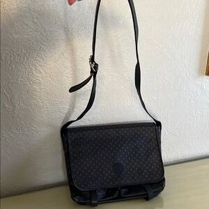This vintage Fendi messenger bag features a stylish monogram pattern that adds a touch of sophistication to its design. Made from a durable textured material, it offers a structured appearance and a practical flap closure. The adjustable shoulder strap ensures comfortable carrying, making it an ideal choice for daily use. Slight wear to the back corners of the bag (see pictures).