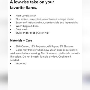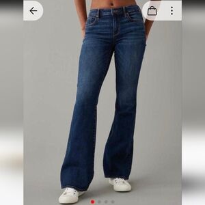 Questions? Leave a comment below!AE Next Level low rise flare jeanThese American Eagle Women's Jeans feature a flared bootcut style in a dark blue denim fabric with a 5-pocket design including button and zipper accents. The jeans are in size 4 with a low rise and a 30-inch inseam, tailored for a regular fit. Made of a blend of spandex and cotton, they offer comfort and stretch, making them suitable for all seasons. The brand logo is featured on the pants, which are easy to care for and showcase a solid color wash. Ideal for a preppy look, these jeans are a versatile addition to any wardrobe.