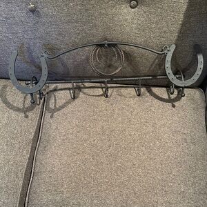 Add a rustic touch to your home with this black horseshoe wall hook rack. Perfect for organizing coats, hats, and more.