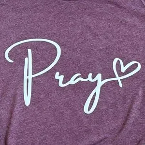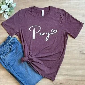 Stylish maroon tri-blend t-shirt with pray w/ heart design. Perfect for casual wear.