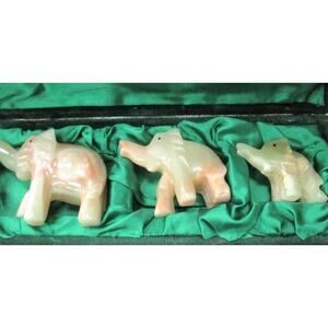 VTG: Feng shui- Asian decor. Set of three individual standing elephant figurines/sculptures hand carved/polished multicolor onyx with their trunks up / varying sizes / encased in a rectangular green silk storage hinged box with locking latch closure. In amazing excellent intact condition. **Disclosure: the box shows shelf wear/faded material & the figurines have scuffs.