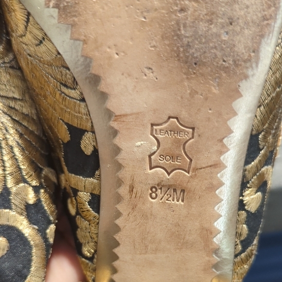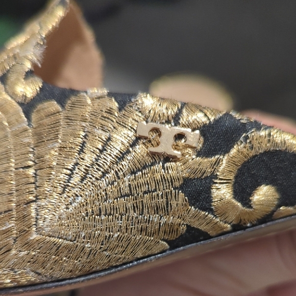 Step into luxury with these Tory Burch slippers, featuring elegant black and gold embroidery. Perfect for adding a touch of sophistication to any outfit.