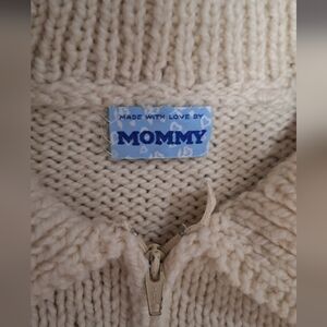 Hand Knit Sweater - jacket kids size 6-7. This is homemade.....hand Knit. I'm not sure of the size. It measures armpit to armpit 17 sholder to bottom is 17 1/2. Armpit to cuff is 12 inches.