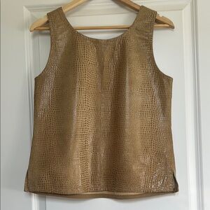 This gold tank top from Double D Ranch features a boxy silhouette and a sleek, minimalist design. The shimmering fabric adds a touch of elegance, making it perfect for both casual and dressy occasions. Its tank top style with wide shoulder straps ensures comfort and versatility.
