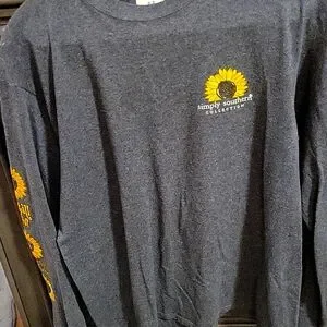 Dark gray with Happy yellow sunflowers. Graphics on back and sleeve. "Be still and know Psalm 46.10