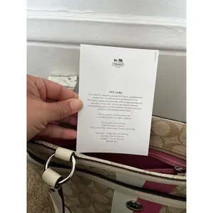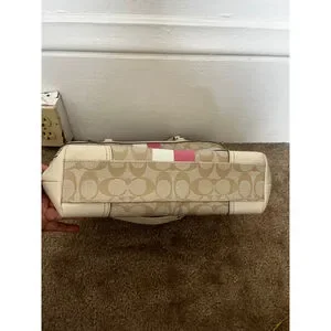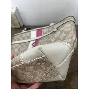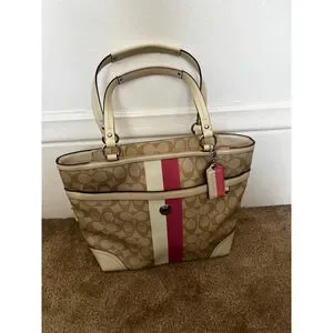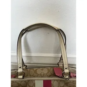 Coach Chelsea Leather Signature Heritage Logo Stripe Pink Beige Tote Bag