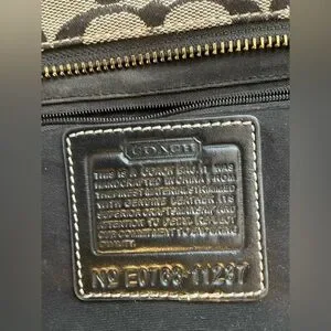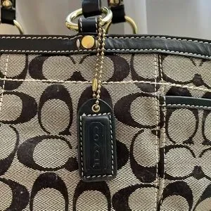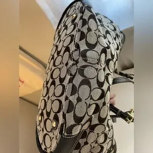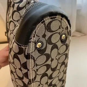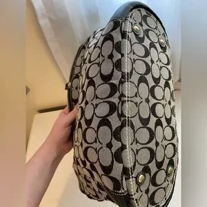 Elevate your style with this Authentic Coach Poppy Signature Tote Bag. Featuring a classic black and tan monogrammed style with signature design. This bag is perfect for any occasion and can hold large capacity in a shoulder bag look.