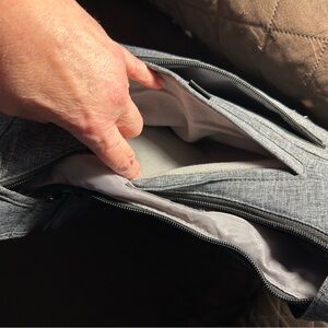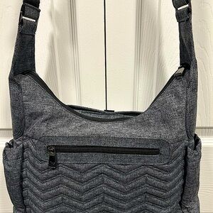 This Camper bag in excellent used condition has two zip pockets in front with a lined slip pocket in fr for your phone, a large zip pocket in back and two side pockets for a water bottle and an umbrella. The one main inside compartment has one large zip pocket, a smaller mesh zip pocket and two padded slip pockets. Everything to keep you organized! Dimensions: L12”X H10”XD3 3/4” Strap extends to 58”