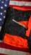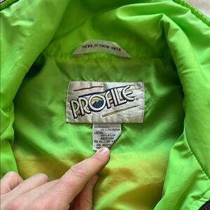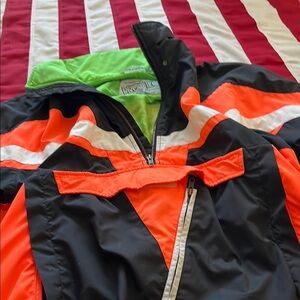 Size M Profile-brand vintage polyester pull-over windbreaker/jacket. Black, orange, neon-green lined. Made in Hong Kong.