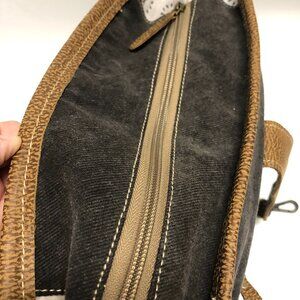 Unleash your bohemian spirit with the Myra Bag Ocean Roar Shoulder Bag, a versatile tote that effortlessly marries style with practicality. Crafted from a rich blend of leather and rug materials, this medium-sized crossbody bag boasts a stunning multicolored exterior with an intricate Indian pattern that captures the essence of Aztec and Western themes. The white interior lining provides a chic contrast, while the adjustable brown leather strap ensures comfortable wear for any occasion. Functionality meets artistry with this bag's unique features, including a secure clip and zip closure to keep your essentials safe. Measuring 14 inches in width and 11 inches in height, it's the perfect size for daily use. Whether you're running errands or heading out for a night on the town, this Myra Bag is a statement piece that complements any outfit with its bold design and timeless appeal.