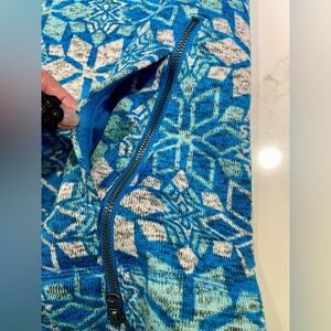 Gently used, no stains, rips or imperfections, warm fleece, hooded, over the head but zippers at bottom and muffle-like pocket or hand warmer. Good Talbots quality and pretty snowflake pattern in blues. Perfect alone or as part of layers.
