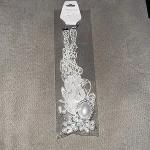 This exquisite choker necklace features delicate white lace adorned with elegant pearls, perfect for adding a touch of sophistication to any outfit.