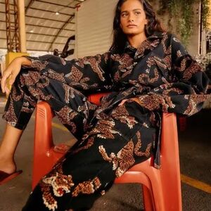 Now it's time to have a fierce style! The Leopard Canvas Jumpsuit is a cool-yet-unique fave to wear on repeat. This leopard jumpsuit has versatile buttons to style in different ways, the length shows off your warm shoes, and the print is already a statement for this season. Invite your cardigan or puffer jacket if it gets too cold <3 leopard jumpsuit - details Easy fit Collared Center front button placket Elastic waistline Detachable belt Long sleeves with buttoned cuffs Cropped legs Composition