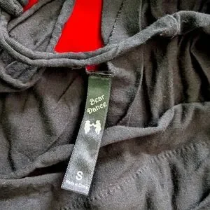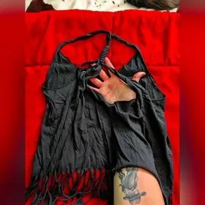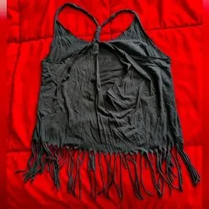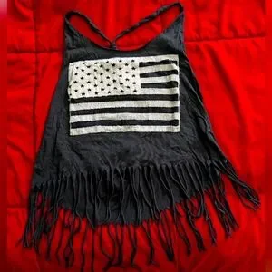 Stylish black tank top featuring a fringe hem and an American flag design on the front.